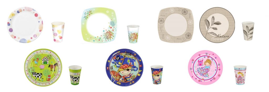 The offer ranges from simple white plates to plain colors and colorful party decors and party sets up to 8 colors.